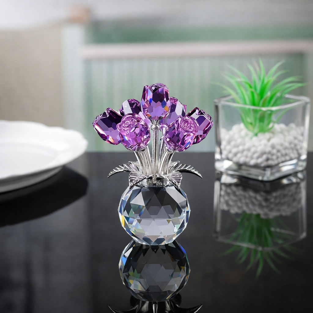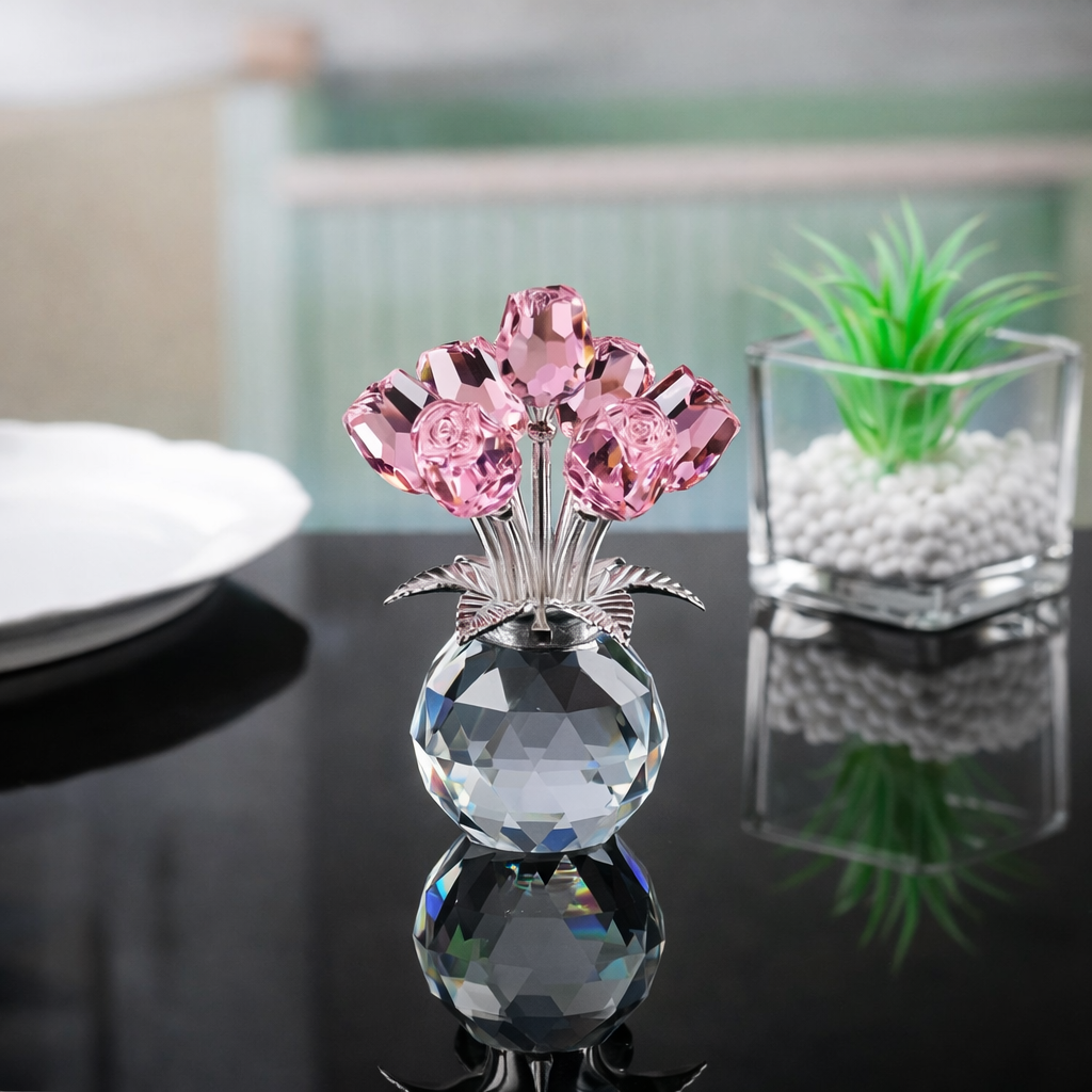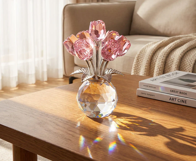 Zodra het licht op het kristal valt, begint de roos zacht te schitteren. Zet haar op een kast, tafel of nachtkastje en ze trekt meteen de aandacht.